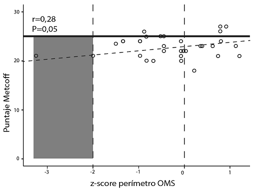 La línea sólida es el punto de corte del puntaje Metcoff. r representa el valor de la correlación de Pearson y P la probabilidad correspondiente. La línea punteada representa la relación lineal entre ambas variables, las líneas segmentadas son la mediana poblacional (0) y -2? perímetro cefálico al nacer.