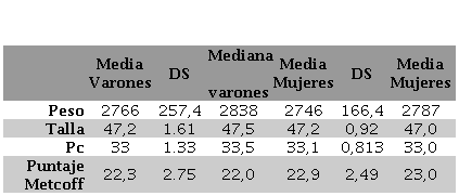 La utilización del análisis de correlación peso, talla y Perímetro cefálico, utilizando la mediana y los valores de Z-score de los parámetros estudiados, sugiere en el presente trabajo que, aunque la diferencia de medias no sea estadísticamente significativa, el uso de la mediana como medida estadística robusta, permite poner de manifiesto diferencias frecuentemente pasadas por alto al utilizar las curvas convencionales de clasificación. Este tipo de análisis se complementa bien con el uso de valores de Z score para los principales parámetros antropométricos.