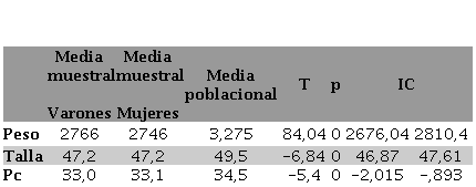 Se observa que las medias de peso, talla y perímetro cefálico difieren estadísticamente de los valores promedio estimados en la población general de neonatos de Cochabambab para los mencionados índices; p=0,000. Los IC son reducidos y no incluyen el 0 ( Tabla 2).