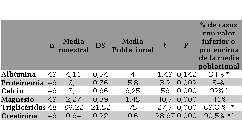 Se muestra a continuación la comparación estadística entre los valores medios de los parámetros bioquímicos de los RN estudiados y los valores de las medias poblacionales (Se consideró el valor promedio de cada parámetro entre los rangos señalados en el inserto técnico de cada prueba utilizada). Se observó que las concentraciones medias de los parámetros estudiados, muestran variaciones dentro de rangos pequeños con respecto a las medias esperadas en población y aun así, la mayor parte de ellos difieren estadísticamente de los valores esperados de acuerdo a los rangos de referencia utilizados para su determinación. El único valor que no difiere del valor medio poblacional es el de albúmina. Los restantes parámetros: proteínas totales, calcio, magnesio, triglicéridos y creatinina muestran promedios estadísticamente diferentes a los de la población; siendo los triglicéridos y la creatinina mayores a los esperados para este grupo etario. Aunque el número total de neonatos estudiados, fue de 53, en algunos casos, no se obtuvo el valor de los parámetros estudiados, por lo que el valor de n es algo menor, 48 y 49 sujetos ( Tabla 3)