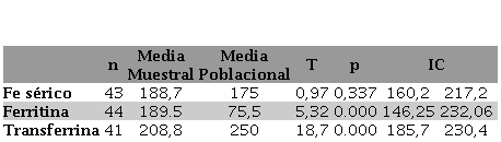 Elaboración propia. Proyecto RCIU-UMSS-ASDIEn el caso del perfil de Hierro, específicamente en relación al Fe sérico, se evidencia que no existe diferencia con el valor medio en población, aunque 51 % presentan valores inferiores a la media y de ellos, 11,6% tienen valores inferiores al límite inferior. Los valores promedio de ferritina y transferrina encontrados en este grupo de neonatos difieren estadísticamente de los valores de la población. Aunque la gran variabilidad de estos parámetros, hace que no puedan utilizarse como referencias confiables, se observa que el 45,4 % de los bebés presentan valores por debajo del límite inferior de determinación (200 Ug/ml); 43,2 % se hallan en el rango normal (entre 200 y 300 Ug/ml) y 11,4 % tienen valores altos ( Tabla 4).