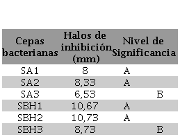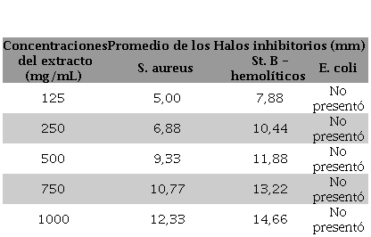 La concentración de 1000 mg/ml logró mayor inhibición de S. aureus y St. B-hemolíticos observándose halos inhibitorios de 12,33 mm y 14,66 mm, respectivamente ( Tabla 1).
