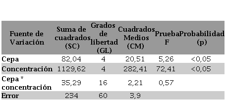 El Análisis de Varianza (ANOVA) evidenció diferencias significativas entre la inhibición de S. aureus y St. B-hemolíticos respecto a las concentraciones evaluadas ( Tabla 2).