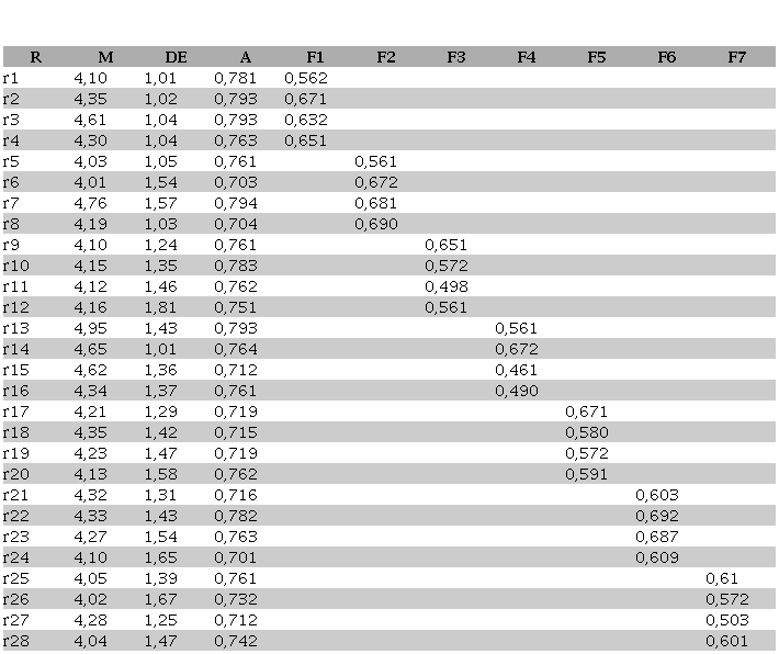 Elaborada con los datos del estudio, Adecuación (KMO = ,865), Esfericidad ?2 = 21,23 (12df) p < ,05 Homocedasticidad (Levene = 1,45 (12 gl) p < ,05). Todos los ítems incluyen cinco opciones de respuesta que van desde 0 = ?nada de acuerdo? hasta 5 = ?bastante de acuerdo?. R = Reactivo M = Media DE = Desviación Estándar A = Alfa quitando el valor el ítemF1 = Social (16% de la varianza total explicada y alfa de ,778)F2 = Sectorial (13% de la varianza total explicada y alfa de ,765)F3 = Académico (10% de la varianza total explicada y alfa de ,780)F4 = Formativo (7% de la varianza total explicada y alfa de ,756)F5 = Familiar (4% de la varianza total explicada y alfa de ,752)F6 = Profesional (2% de la varianza total explicada y alfa de ,790)F7 = Personal (1% de la varianza total explicada y alfa de ,760)