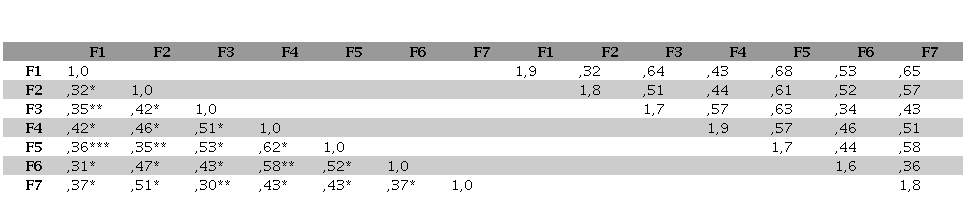 La estructura de siete factores explicó el 53% de la varianza. Estos siete factores fueron relacionados entre sí con el propósito de observar su estructura de asociaciones y covarianzas ( Tabla 2).