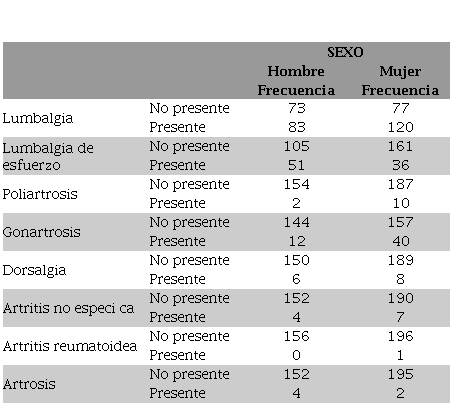 Se realizó el conteo de la frecuencia de las patologías presentadas disgregadas por sexo ( Tabla 1).