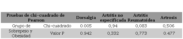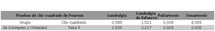 Se realizó el análisis estadístico de asociación de variables categóricas, en base a rangos del índice de masa corporal (sobrepeso y obesidad) con las enfermedades musculoesqueléticas (ver Figura 3 y 4), donde se encontró que no existe asociación entre los rangos de sobrepeso y obesidad de la OMS con la lumbalgia, lumbalgia de esfuerzo, artrosis, artritis no específica ( Tabla 2), artritis reumatoidea, dorsalgia y poliartrosis, encontrándose solamente una asociación con la gonartrosis (X 2=8, p=<0,005; para más detalles ver Tabla 3