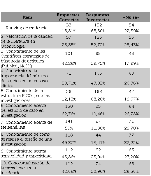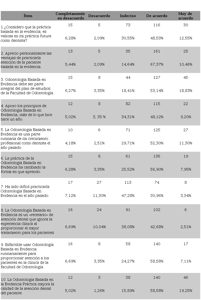 De un total de 239 estudiantes, 116 (48,53%) indicó que la práctica Basada en Evidencia es parte importante en la práctica profesional y 161 (67,37 %) estuvo de acuerdo con practicar la atención del paciente basada en la evidencia, 136 (56,90 %) indicó estar de acuerdo en que la OBE puede cambiar la forma de aprendizaje. 102 (42,68%) de los estudiantes consideran que la OBE es un «recetario» de atención dental ya que ignora la experiencia clínica ( Tabla 2).