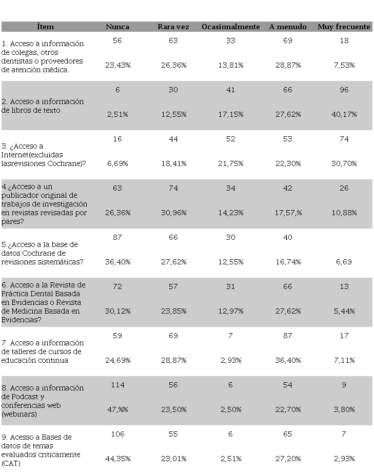 Por lo que a continuación describimos los porcentajes mayores de cada ítem: 69 (28,87%) de los estudiantes respondieron que acceden a menudo a la información de colegas, otros dentistas o proveedores de atención médica. Los estudiantes respondieron que acceden a libros de texto en busca de información en forma frecuente, en un número de 96 (40,17%).