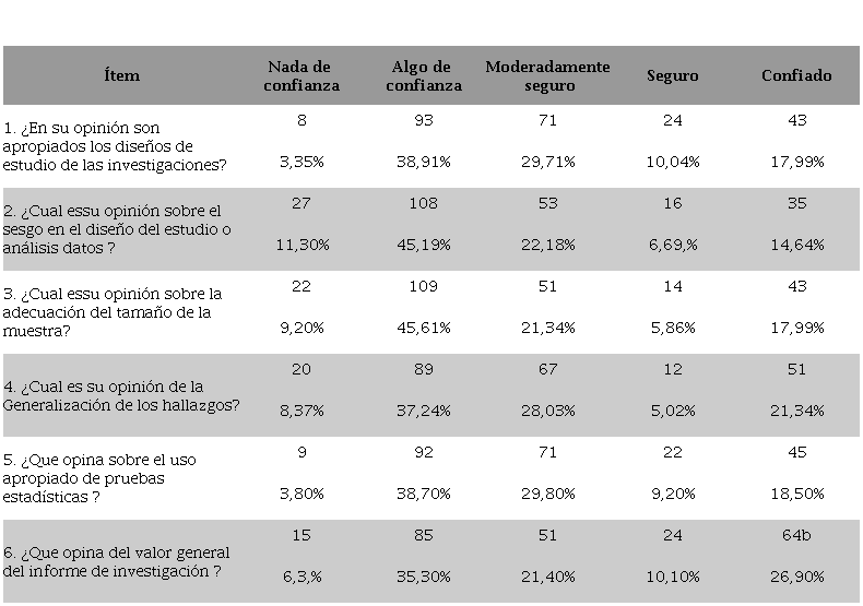 En lo referente al sesgo en las investigaciones, 108 (45,19 %) de los estudiantes respondieron tener algo de confianza. En cuanto a la adecuación del tamaño de la muestra, 109 (45,61%) estudiantes indicaron estar con algo de confianza. Con respecto al valor general del informe de investigación 85 (35,3%) de los estudiantes indicaron tener algo de confianza ( Tabla 4).