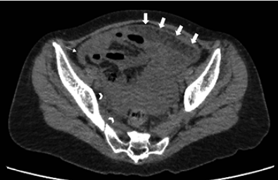 Cuando el engrosamiento peritoneal es más irregular y de predominio nodular, se debe incluir en el diagnóstico diferencial la carcinomatosis 10.