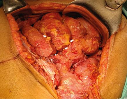 Con esos datos fue hospitalizada con los diagnósticos de abdomen agudo y probable apendicitis aguda; se realizó una laparotomía exploratoria con los siguientes hallazgos: bridas y adherencias firmes interasas en toda la extensión del intestino delgado y grueso con evidencia de fibrosis extensa, tejido blanco nacarado en fondo de útero, fétido, presencia de múltiples nódulos de aspecto caseoso de hasta 3 cm de tamaño distribuidos en peritoneo parietal y mesenterio ( Figura 3), con aspecto de carcinomatosis peritoneal vs endometriosis grado IV vs tuberculosis peritoneal. Se tomaron muestras de los tejidos descritos antes de cerrar cavidad, los cuales fueron enviados a patología.