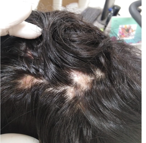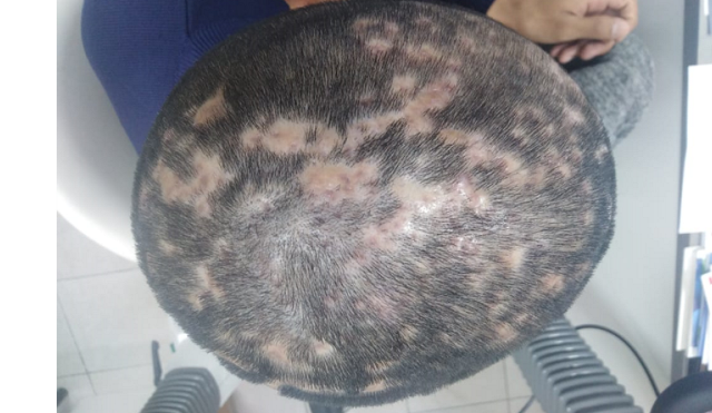 Acudió a consulta por lesiones pustulosas en cuero cabelludo de aproximadamente dos años de evolución.