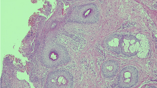 Biopsia de cuero cabelludo (punch): fragmento de cuero cabelludo con costra de fibrina y elementos inflamatorios, dermis: infiltrado inflamatorio de linfocitos y neutrófilos que producen lesión de los folículos pilosos y disminución del número de bulbos foliculares, no se identifica fibrosis en el material estudiado.
