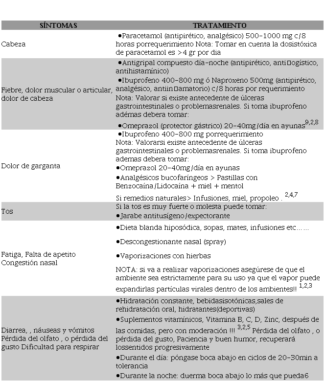 Para hacer un resumen breve de los síntomas que presenta la COVID-19 en su fase inicial adjuntamos a la presente los medicamentos básicos y de fácil acceso en nuestro país, incluyendo sus indicaciones, dosis, y efectos adversos en un formato de fácil descripción, para su sencilla interpretación.