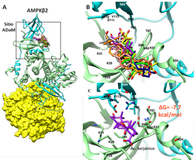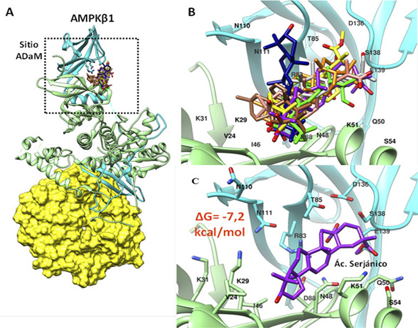 Representación esquemática de AMPK-β2. Subunidad α (verde), Subunidad β (celeste) y Subunidad γ (amarillo). El recuadro negro señala la región de unión de las Sapogeninas que coincide con el sitio ADaM. B. Superposición de la estructura química de las Sapogeninas en el Sitio ADaM, además, se indican los principales aminoácidos presentes en este sitio (códigos de una letra). C. Acoplamiento Molecular del Ácido Serjánico (púrpura) con un ΔG de Interacción de -7,7 kcal/mol.