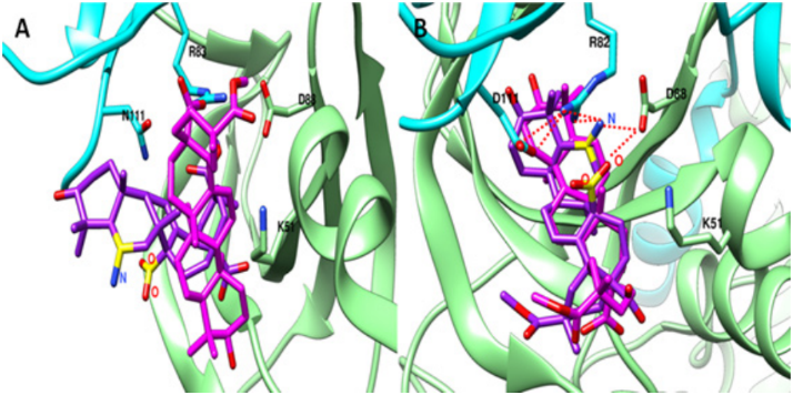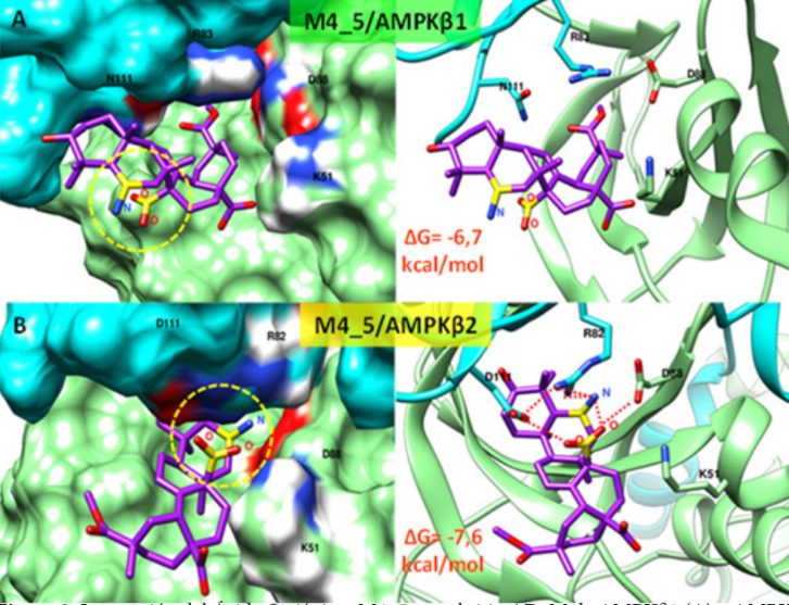 A nivel estructural, la comparación de la interacción de la variante M4_5 con las isoformas AMPK-α2β1γ1 y AMPK-α2β2γ1, muestra que los dos grupos funcionales -NH2 (M4) y –COOH (M5) añadidos al ácido Serjánico forman una red de puentes de hidrógeno con los residuos β2D111, β2R82 y α2D88 en el sitio ADaM de la isoforma muscular de AMPK (α2β2γ1) (Figura 3B). Sin embargo, estos grupos funcionales añadidos se orientan hacia el exterior del sitio ADaM al interaccionar con la isoforma AMPK-α2β1γ1 debido probablemente a la ausencia del residuo D111 (Figura 3A). La formación de esta red de puentes de hidrógeno permite que la interacción de la variante M4_5 sea más específica para la isoforma muscular de AMPK, debido a que no está presente con la isoforma AMPK-α2β1γ1, lo que concuerda con los valores de ΔG calculados anteriormente.