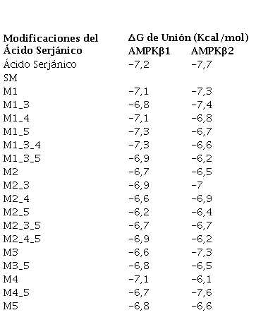 Puesto que la activación de la isoforma AMPK-α2β2γ1 es de especial interés a nivel clínico debido a su localización en músculo esquelético y su función biológica relacionada con la homeostasis de glucosa por una ruta independiente de insulina, se realizaron diferentes modificaciones químicas en el ácido Serjánico (M1-5), introduciendo algunos grupos funcionales hidrofílicos como -NH-, -NH2, -COOH y -OH en posiciones concretas que permitan una interacción más favorable y específica con el residuo β2D111 característico del sitio ADaM en la isoforma muscular de AMPK (α2β2γ1). Con las cinco diferentes modificaciones químicas se analizaron un total de 17 posibles combinaciones. La variante química del ácido Serjánico M4_5 obtuvo un ΔG de interacción más favorable y específico (-7,6 kcal/mol) con relación al resto de moléculas ensayadas (Tabla 2). Aunque este valor se aproxima al ΔG calculado para el ácido Serjánico sin modificar (-7,7 kcal/mol), la variante M4_5 reduce en gran medida su especificidad por la isoforma AMPK-α2β1γ1, debido a que su ΔG de interacción con esta isoforma se incrementa de -7,2 a -6,7 kcal/mol (Tabla 2).