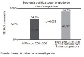 Fuente: bases de datos de la investigaciónEn total, 61 tienen una serología positiva, lo que corresponde a una sensibilidad de 77,3% (CI95%: 67,7-85,1). De los pacientes HIV+ con menos de 300 CD4, HIV+ con más de 300 CD4 y los que tienen una enfermedad oncológica, hematológica o reumatológica (con serología VIH negativa o desconocida), 64,5% (20/31), 90,0% (9/10) y 83,0% (39/47) tienen la serología positiva, respectivamente. La sensibilidad en los pacientes HIV+ con CD4<300 es de 64,5% (20/31) y en el grupo de pacientes HIV+ con CD4>300 o que tienen una enfermedad oncológica, hematológica o reumatológica con serología VIH negativa o desconocida, la sensibilidad fue de 84,2% (48/57) (p=0,035) (Figura 1).