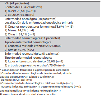 * Con indicación transitoria a la prescripción de corticoides †Otras localizaciones oncológicas de la enfermedad primaria: aparato digestivo (n=3), cabeza y cuello (n=3); pulmones (n=2); piel (n=1) ‡Otras enfermedades hematológicas: mieloma múltiple (n=1); leucemia linfocítica crónica (n=1); trastorno mieloproliferativo (n=1); anemia hemolítica (n=1); linfoma no Hodgkin (n=1)