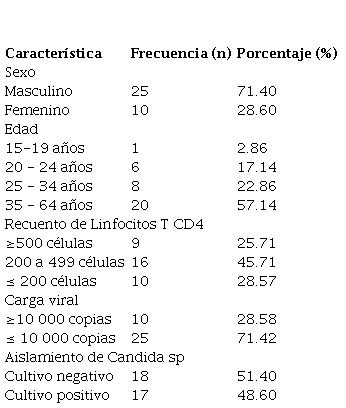 De los 35 PVVS incluidos en el estudio, de los cuales el 71,40% (25) fueron hombres y 28,60% (10) mujeres, siendo la edad media 36,51 años, el grupo de edad con más frecuencia de afectados correspondió al de 35 a 64 años con 20 PVVS (57,14%). En cuanto al recuento CD4, 45,71% (16) PVVS tuvieron recuentos de CD4 entre 200 a 499 células, 28.57% (10) presentaros recuentos inferiores a 200 células y en el 25,71% (9) obtuvieron recuentos superiores a 500 células; respecto a la CV el 71,42% (25) tuvieron menor a 10 000 copias y el 28,58% (10) mayor igual a 10 000 copias. Asimismo 48,60% (17) fueron positivos a Candida spp (Tabla 1).