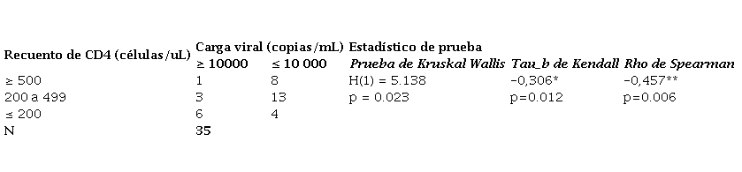 Al contrastar el recuento de CD4 con los niveles de carga viral se encontró correlación significativa inversa entre ambas variables (rho de Spearman = -0,457, p=0,006; Kendall Tau-b= -0,306, p=0,012), esto indica que a niveles bajos de CD4 la CV aumenta. (Tabla 2).