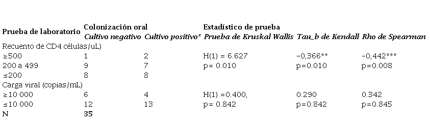 Análisis estadístico: El software estadístico usado fue SPSS versión 22,0. Para establecer asociación de los parámetros con la colonización oral por Candida se aplicó el estadístico de prueba de Kruskal Wallis. Las correlaciones entre el recuento de CD4, CV y colonización oral por Candida se establecieron utilizando Tau b de Kendall y Rho de Spearman considerándose significancia estadística con un valor p <0,05.