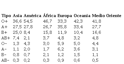 Los tipos de sangre O-, A-, B- y AB- son las de menor porcentaje de existencia en las diferentes regiones del mundo. La sangre O+ es más frecuente encontrarla en América, la A+ en Oceanía, la B+ en Asia al igual que la AB+, como se puede apreciar en la Tabla 1.