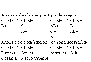 En la Tabla 2, se puede apreciar que en un mismo clúster figura Europa y Oceanía en relación a la donación de sangre, en otro grupo se clasifica África y Medio Oriente. América y Asia se encuentran en grupos independientes. El tipo de sangre B- y AB- pertenecen a un mismo clúster en relación al porcentaje de sangre existente a nivel mundial, igual sucede con los tipos de sangre A+ y O+. La sangre tipo B+ pertenece a un único grupo.