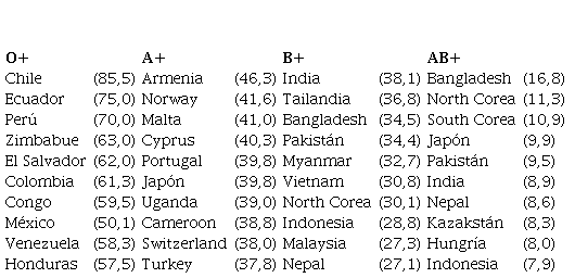 La sangre O+ es más frecuente encontrarla en países de América, de manera especial en Sudamérica, la presencia de sangre A+ posee mayor diversidad de países ubicados en Europa, África y Asia, donde se destaca Armenia como la nación que tiene el mayor porcentaje. La sangre B+ es más común encontrarla en países ubicados en Asia, mientras el tipo de sangre AB+ presentan las estadísticas más bajas en términos porcentuales. Ver Tabla 3.