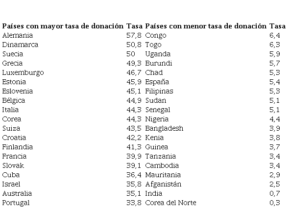 Alemania presenta la mayor tasa de donación de sangre, seguido de Dinamarca. En general se aprecia que en los países de Europa existe mayor cultura de donación, mientras en naciones ubicadas en África y algunos países de Asia, se dan las estadísticas más bajas en relación al tema. Ver Tabla 4.