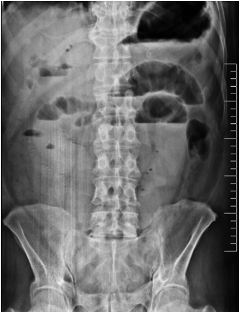 En relación a los hallazgos imagenológicos, la imagen en pila de monedas sigue teniendo alto valor diagnóstico en patologías obstructivas del intestino delgado como es en el caso nuestro, al igual que menciona Carpio-Deheza G5 en su publicación de abdomen agudo quirúrgico. En mención a imagenología se recomienda una adecuada valoración de los estudios iniciales que en sospecha de íleo biliar podrían ayudar al diagnóstico y evidenciar la conocida Triada de Rigler, que hace mención de la conjunción en la radiografía de abdomen de pie de: neumobilia, asas de intestino delgado dilatadas y la visualización directa o indirecta de un cálculo en intestino delgado, y en ocasiones, el cambio de posición del lito en radiografías de control. En la revaloración del caso de nuestro paciente se evidencia dos de estos signos específicos, asas de intestinos delgado dilatadas y una tenue imagen sugerente de neumobilia, siendo el hallazgo de dos de los signos de la triada de Rigler patognomónicos de íleo biliar según Aguila-Gomez MV; es así, que el uso de ésta puede ayudar y prescindir de elementos no coste-accesibles en algunos casos8.