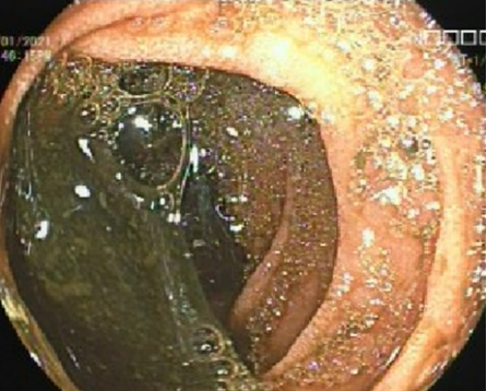 Paciente masculino de 72 años de edad, de raza mestiza, cuyo único antecedente patológico fue hiperplasia prostática diagnosticada un año, tratado con dilatación uretral, sin antecedentes quirúrgicos, acude al servicio de emergencias del Instituto de Gastroenterología Boliviano Japonés (IGBJ), Cochabamba, Bolivia, en enero de 2 021, referido de un Hospital de segundo nivel de atención, con el antecedente de presentar cuadro clínico de 15 días con dolor abdominal difuso, a predominio de hemiabdomen izquierdo, tipo espasmódico, de inicio progresivo y moderada intensidad, acompañado de distensión abdominal, náuseas que no llegaron al vómito, dificultad para la eliminación de heces y gases, hiporexia y adinamia, por lo que acude en primera instancia a hospital de segundo nivel local donde se lo interna con el diagnóstico de síndrome de retención gástrica y deshidratación severa, se realiza plan terapéutico con sonda nasogástrica (no teniéndose dato de la obtención del débito de la misma), soluciones cristaloides, omeprazol y metronidazol endovenosos (EV), con lo que refieren mejoría clínica. A la vez el paciente es diagnosticado de SARS-COV2 a los 3 días de ingreso hospitalario mediante técnica de reacción en cadena de la polimerasa (PCR) y refiriendo haber recibido tratamiento con el que hubo mejoría, pero no se indica en que consistió el mismo. Para el sexto día de internación el paciente había presentado ausencia de dolor y distensión abdominal, además de tránsito intestinal (+), por lo que se realiza inicio y progresión de la dieta. Al día siguiente, presenta nuevamente dolor, distensión abdominal, náuseas y vómitos de aparentes características porraceas, con descompensación y deterioro del estado general y pulmonar con desaturación. Seis días después, ante la no mejoría del cuadro, se lo refiere a tercer nivel solicitando estudio de endoscopia digestiva alta en el IGBJ.
