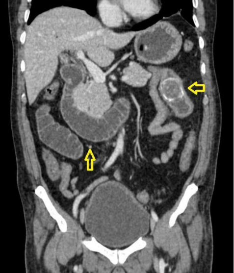 Nuevamente en contexto, tras realizarse el estudio de endoscopia se decide investigar la causa de la obstrucción a través de estudios ampliados de imagen, TAC de abdomen con contraste3, con el que se define el diagnóstico y se justifica el abordaje quirúrgico.