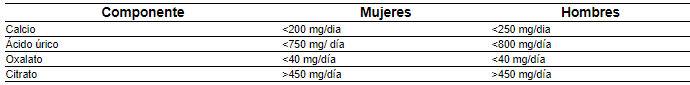 Parámetros laboratoriales: Se presenta los valores mas importantes en el Tabla 1. La concentración de factores litogenos y sobresaturación urinaria se debe medir, especialmente la excreción de sodio debido a que una mayor ingesta se relaciona con mayor excreción de Calcio y afecta la respuesta a los diuréticos.