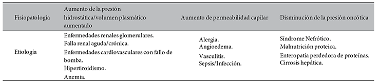 Las proteínas pueden estar ausentes del capilar por diferentes etiologías (Tabla 1). El síndrome nefrótico es una de las principales causas de edema generalizado en pediatría, secundario a la perdida de proteínas por el glomérulo renal, el mecanismo es aumento de la permeabilidad a proteínas por lesión de los podocitos o de su hendidura diafragmática, destaca la proteinuria masiva detectable por dipstick o cuantificada con un índice de proteinuria creatininuria >2,0 mg/mg en una orina aislada8,9,10. En el síndrome nefrítico la inflamación del glomérulo renal es de causa infecciosa e inmunológica y produce proteinuria significativa y hematuria, puede asociarse caída del filtrado glomerular, retención de sodio, agua y edema de menor magnitud que el síndrome nefrótico. Las causas más frecuentes son la glomerulonefritis postinfecciosa, la nefropatía por IgA, la nefropatía lupica. Estas enfermedades requieren la determinación del nivel de complemento (C3, C4) para poder aproximarse al diagnóstico11,12. La malnutrición proteica (Kwashiorkor) que resulta de la baja síntesis de albumina, se presenta con edema generalizado, rash cutáneo, hipopigmentacion del cabello, cabello rojizo. Esta entidad rara en el mundo, sigue estando presente en nuestro país13,14.