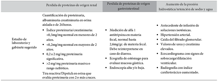 Se describe a continuación una sugerencia de estudio que ayudan a encontrar la etiología del síndrome edematoso generalizado en pediatría, elaborado y modificado de Repetto y Cols. Ver Tabla 1 y 2.