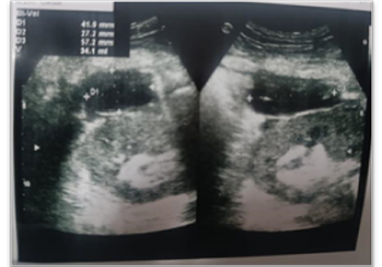 Paciente masculino de 57 años presenta antecedentes de: Enfermedad Renal Crónica en hemodiálisis desde 2019, Hipertensión Arterial controlada y monorreno derecho por nefrectomía izquierda simple por litiasis coraliforme izquierda, Bolsa hidronefrótica, episodios de infección urinaria recurrente y quiste renal izquierdo con reporte histopatológico de “Quiste simple renal en polo superior, pielonefritis crónica, glomerulonefritis global y difusa”. El mismo ingresa a protocolo de trasplante renal siendo el donante su hijo, compatible con el mismo, llevándose a cabo el trasplante en fecha 08/12/2022, teniendo como hallazgos a presencia de 4 arterias y 2 venas en el injerto renal, de las cuales 1 de las arterias de difícil anastomosis, siendo hospitalizado por 10 días y externado con drenaje en espacio quirurgico, en buenas condiciones, sin embargo paciente ingresa al servicio de urgencias de Urología en fecha 02/01/2023 con hematuria macroscópica y disminución del volumen urinario, y con reporte ecográfico de hematoma organizado de 34 cc en polo superior de Injerto renal, además de colección en plano abdominal (TCS) de 250 a 300 cc, por lo que se realiza drenaje de colección por vía percutánea evidenciando la salida de abundante liquido seroso, el cual se conecta a drenaje aspirativo, con una cuantificación de 1 500 ml en las primeras 24 hrs.(Figura 1)