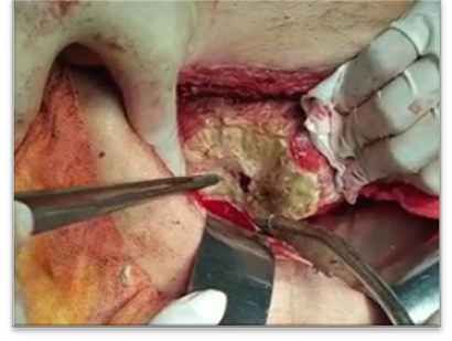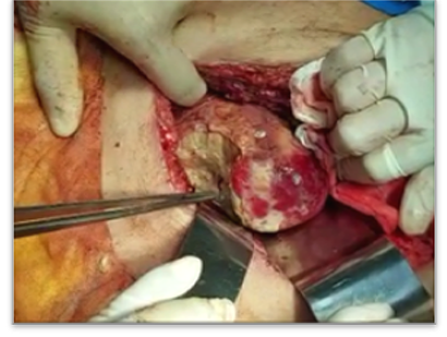 Paciente durante la hospitalización cursa con datos de proceso infeccioso complicado además de presentar volúmenes urinarios cada vez menores, sin respuesta a tratamiento médico, además de presentar salida de grandes cantidades de líquido seroso por drenaje, hasta llegar a presentar criterios de sepsis a foco urinario con cultivos positivos para Enterobacter Cloacae y Staphilococcus aereus e insuficiencia renal con requerimiento de Hemodiálisis en dos oportunidades, evolucionando de forma desfavorable a pesar del tratamiento antibiótico, por lo que se decide la realización de Urotomografía simple donde se evidencia la presencia de líquido a nivel de fascia superficial y profunda de aproximadamente 400 cc, de densidad heterogénea sugestivo de urinoma (Figura 2) por lo que servicio de Urología decide ingresar a quirófano de urgencia para exploración quirúrgica y drenaje de colección periinjerto renal, evidenciando en el transquirúrgico la presencia de un absceso perirrenal, hematoma de polo superior y necrosis de toda la cara posterior del injerto renal que compromete hasta la pelvis renal con evidencia de salida de orina por el mismo, evidenciando apertura total de pelvis renal con salida franca de orina. (Figura 3)(Figura 4).
