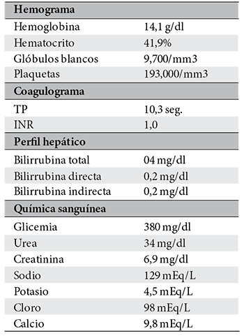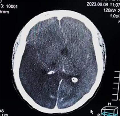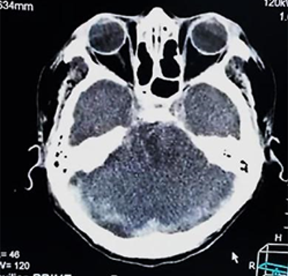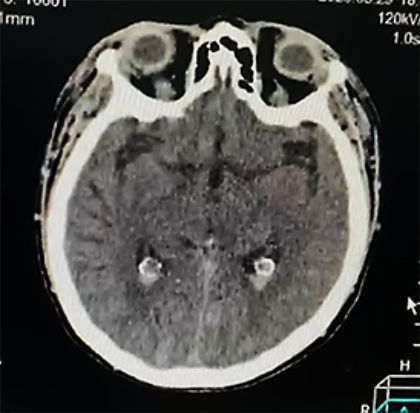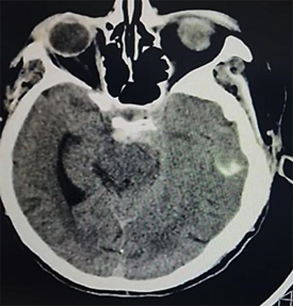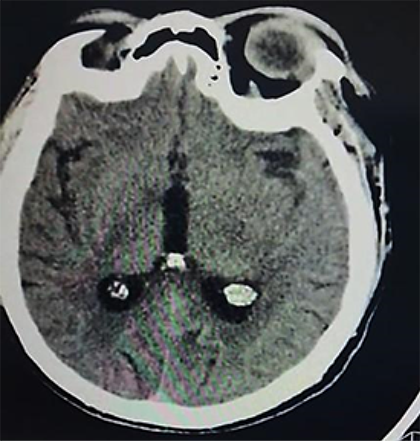 Paciente femenino de 52 años, proveniente y residente de Cochabamba, provincia Quillacollo, acude al servicio de emergencia del Hospital Obrero Nro. 2 de la Caja Nacional de Salud; con antecedentes de diabetes mellitus tipo 2, hipertensión arterial, enfermedad renal crónica, estadio 5 en hemodiálisis y un accidente cerebrovascular hemorrágico hace 1 año; es medicado con metformina 850 mg, carvedilol 12,5 mg, losartan 100 mg, alfa metildopa 500 mg y recibe hemodiálisis desde hace 1 año, trisemanal; presenta un cuadro clínico de 8 horas de evolución caracterizado por cefalea holocraneana, pulsátil, súbito, de intensidad moderada, acompañado de somnolencia, entumecimiento a nivel de columna cervical-dorsal, paraparesia de extremidades inferiores y una escala de coma de Glasgow de 11-12/15. Ingresa por emergencia en mal estado general, con tendencia a la hipertensión PA: 231/174 mmHg, PAM: 183, FC: 96 latidos/min. Saturación de oxígeno 91% aire ambiente. Se solicitan algunos laboratorios: Glicemia 380 mg/dl, creatinina 6,9 mg/dl, sodio: 129 mEq/l (Tabla 1); rápidamente se solicita una tomografía axial computarizada de cráneo (TAC) simple (Figura 1a, b).
