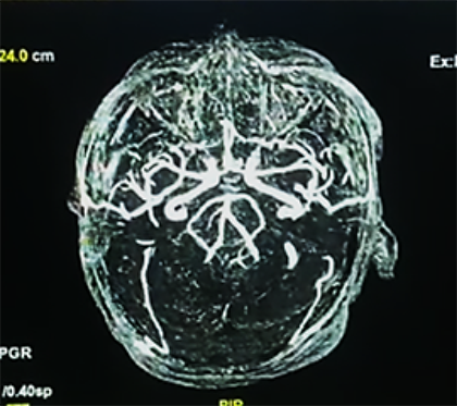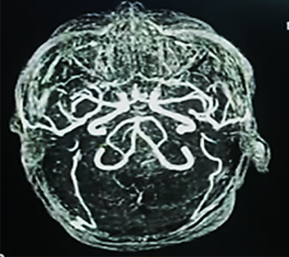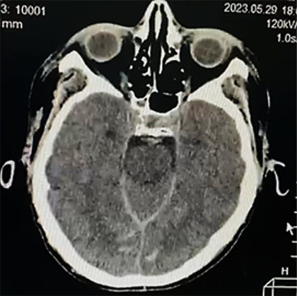 Ingresa con los diagnósticos de: accidente cerebrovascular hemorrágico (peri-troncal); Crisis hipertensiva tipo emergencia; hiponatremia hipotónica hipervolemica; enfermedad renal crónica KDIGO 5 en hemodiálisis; diabetes mellitus tipo 2 mal controlada e hipertensión arterial sistémica. Permaneció bajo monitorización continua de la presión arterial, asociado a vasodilatadores endovenosos (nitroprusiato de sodio 3-5 ug/k/min), seguimiento por el servicio de nefrodialisis, para continuar terapia de reemplazo renal; por otro lado fue evaluado por el servicio de neurocirugía quien indico por el momento tratamiento médico, asociado a medidas de protección cerebral; además fue evaluado por el servicio de cardiología, solicitando una ecocardiograma transtorácico: Hipertrofia concéntrica del ventrículo izquierdo, motilidad regional preservada, fracción de eyección de ventrículo izquierdo (FEVI) 66%; se realizó una Rx de tórax PA que mostro leve redistribución vascular pulmonar, catéter venoso central in situ; por otro lado en fecha 24/05/23 se realiza una angio resonancia magnética de cerebro que muestra hemorragia subaracnoidea y sangre en area prepontina, premedular y peripeduncular, además de cisuras frontoparietooccipitales, dilatación de tercer ventrículo, enfermedad vascular tipo microangiopatia (Figura 2a, b).