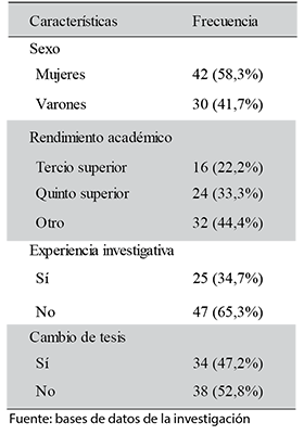 La encuesta fue respondida por 72 estudiantes (tasa de respuesta de 85,7%), se encontró una edad promedio de 23,5 ± 1,25 años. El 58,3% (n=42) fueron mujeres, mientras que 16 estudiantes pertenecieron al tercio superior (Tabla 1).
