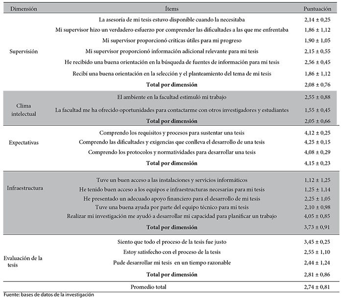 El promedio general de la satisfacción fue 2,74 ± 0,81, obteniéndose un promedio de 2,08 ± 0,76 para la dimensión supervisión, 2,05 ± 0,66 para la dimensión clima intelectual, 4,15 ± 0,23 para la dimensión expectativas, 1,92 ± 1,17 para la dimensión infraestructura, 3,73 ± 0,91para la dimensión habilidades y 2,81 ± 0,86 para la dimensión evaluación de la tesis (Tabla 2).