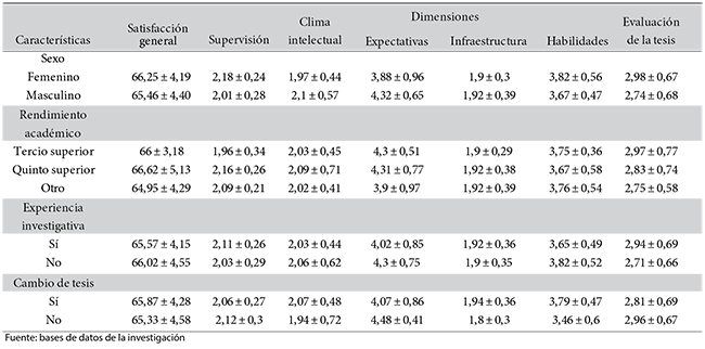 La satisfacción general tuvo un puntaje de 65,78 ± 4,29 (Rango: 57-78), considerándose como “moderada”. Las mujeres tuvieron un mejor puntaje de satisfacción (p>0,05), no se encontraron diferencias significativas de la satisfacción general según rendimiento académico, experiencia investigativa previa o el haber cambiado de tema de tesis (Tabla 3).