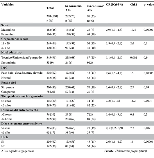 También se encontró la relación significativa de los factores sociodemográficas con relación al consumidor, se comprobó que el consumo de ayudas nutricionales y farmacológicas fue más común en hombres, con IMC alterado, que realizan actividad física en gimnasios más de cuatro años, acuden varias veces a la semana para entrenarse y realizan alguna dieta.
