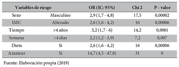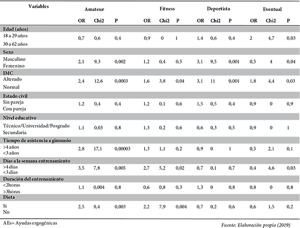 Las características del consumidor de ayudas ergogénicas nutricionales y farmacológicas (Tabla 5). El consumidor es de sexo masculino con un índice de masa corporal alterado, mayor tiempo en el gimnasio, mayores días de entrenamiento en la semana, con una dieta alimentaria y pertenecer al grupo amateur.