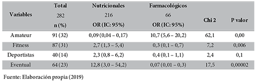 Se investigó la relación entre consumidores de ayudas ergogénicas nutricionales versus farmacológicas por grupo estratificado. Donde pertenecer al grupo Amateur tienen diez veces más posibilidad de consumir una ayuda ergogénica farmacológica, y un factor de protección para consumo de ayuda ergogénica nutricionales con un valor de p <0,05 (0,00) siendo estadísticamente significativo.