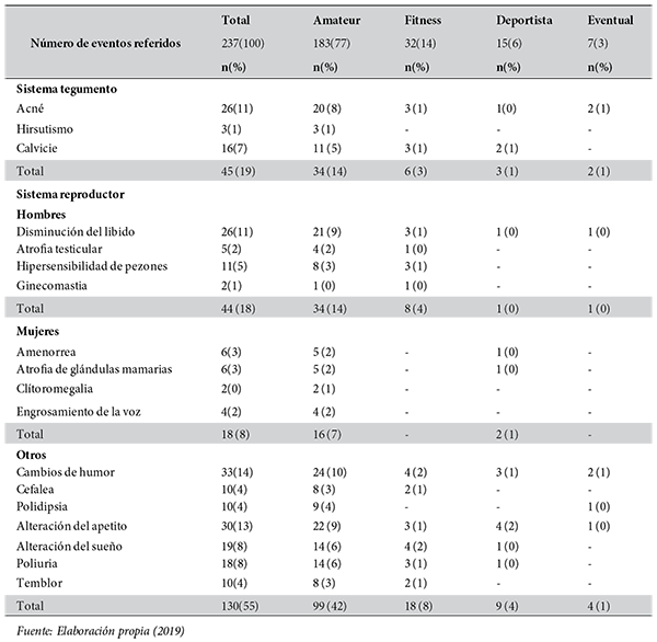 Se encontró en nuestro estudio efectos secundarios basado en las percepciones del consumidor de las ayudas ergogénicas farmacológicas (principalmente esteroides anabólicos androgénicos), donde se encuentra un total de 237 efectos percibidos subdividido en sistema tegumentario del 19%, del cual el acné ocupa el 11%, calvicie el 7% e hirsutismo 1%, entre otros efectos el más frecuente cambio de humor el 50%. En el sistema reproductor masculino se identificó con alteración de la libido 52%%, hipersensibilidad de pezones el 22%, atrofia testicular 10%, ginecomastia 4% (dos hombres). También se encontró en el sexo femenino amenorrea 38%, atrofia de las glándulas mamarias 38%, engrosamiento de la voz el 25%, clítoromegalia 13% (dos mujeres).