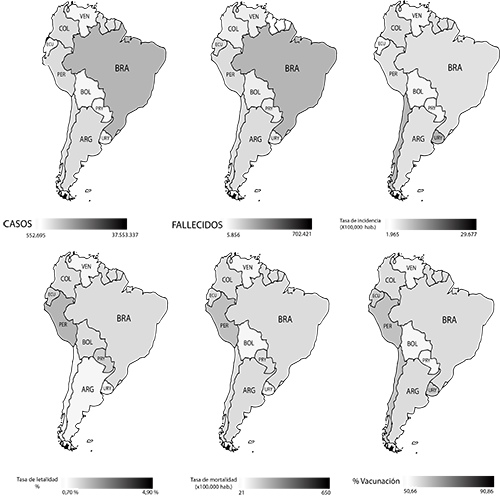 Los datos fueron ingresados y consolidadas en una base de datos en el programa Microsoft Excel© y analizadas utilizando el software estadístico STATA V-16 ®; realizando en la misma el análisis descriptivo de la información presentadas como frecuencias absolutas, porcentajes y tasas; habiéndose calculado las tasas de incidencia, mortalidad, letalidad y las coberturas de vacunación, desagregadas por países y departamentos. En todos los casos, para el cálculo de indicadores epidemiológicos se utilizó como población de referencia a la estimación realizada por el Banco Mundial y el Instituto Nacional de Estadística de Bolivia para la mitad de periodo del 2021. También se generaron gráficos de mapas en base a su módulo de generación de mapas coropléticos, describiendo la distribución de los indicadores evaluados por países y municipios, según la información disponible.