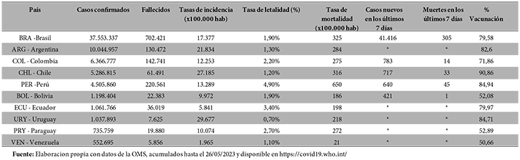 Los datos nacionales de los países sudamericanos se obtuvieron de la plataforma del panel de control de la enfermedad por coronavirus (Covid-19) disponibles para descargar en la página: https://covid19.who.int/9.